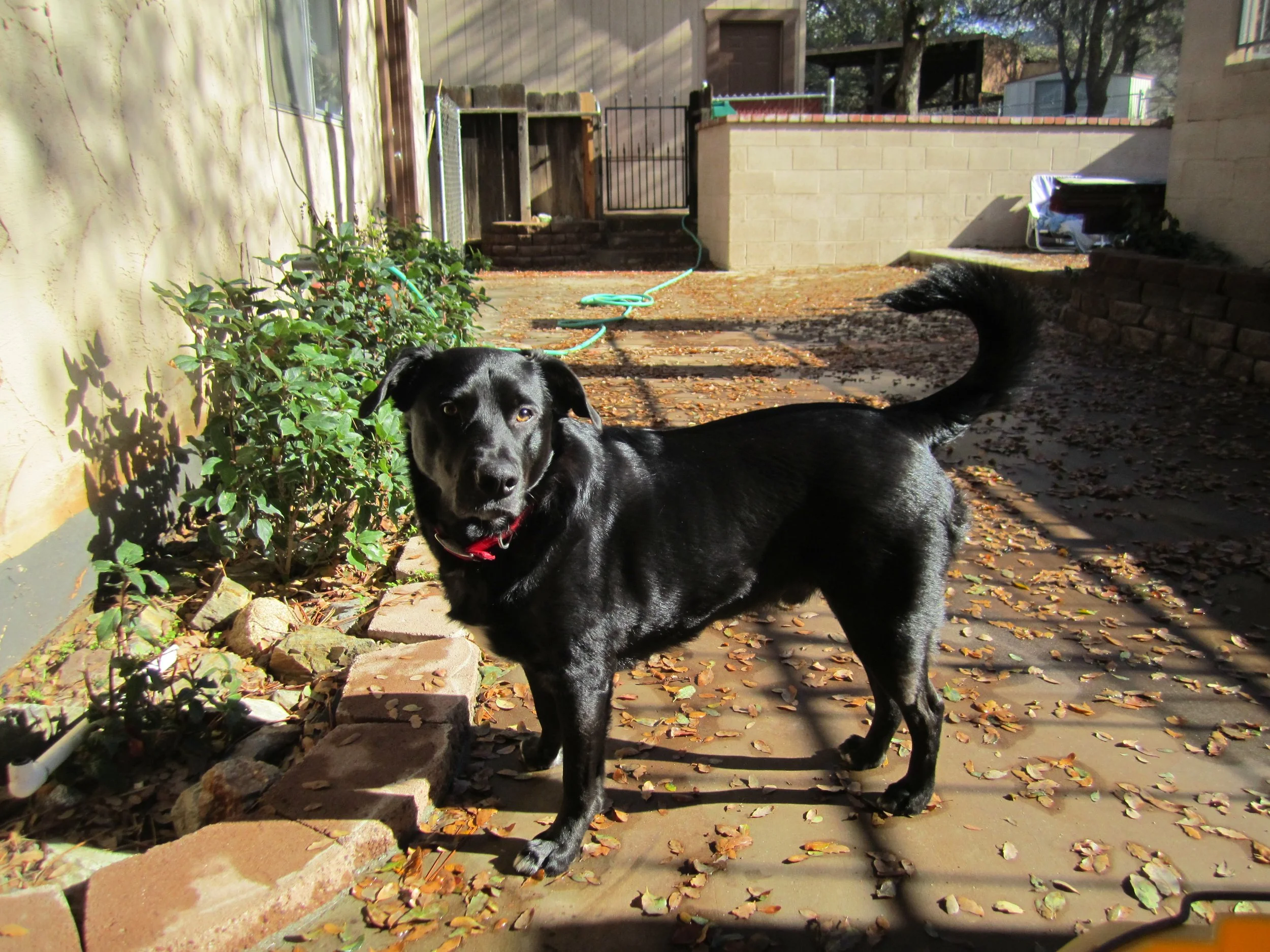Abby lived the best years of her life at Cook Peak. Inside, the house was enormous to her. In the fenced backyard, there was a gigantic dog run behind the garage; a back patio the length of the house, a kennel area with an automated water spigot, plus, there was plenty of space around the cement pond to run laps. Compared to her tiny backyard in the city with only a flowerbed for relief, Abby lived in dog paradise. Her transformation from a city dog to mountain canine was inevitable. We were too busy to drive her to Bakersfield for pretty haircuts and gave her bad ones ourselves with sewing scissors. We changed her diet to dry food for fat dogs. But the best change occurred when Abby stopped bolting. We decided that rather than forcing her to live behind walls and fences, we’d open the front door and let her go. She always came back. Mostly she made her rounds and chased a squirrel or two. Her favorite pastime was sprawling on the grassy hill of our front yard and dozing in the sunshine. When she was ready to come inside, she knocked.